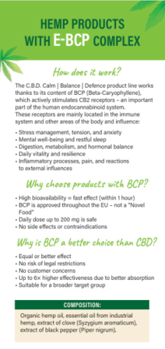 The basis is cold-pressed BIO and essential hemp oil. The oil is enriched with a mixture with a high content of e-BCP (beta-caryophyllene). The essential oil is produced using steam distillation, a gentle method that ensures the preservation of its valuable aromatic and bioactive components.
