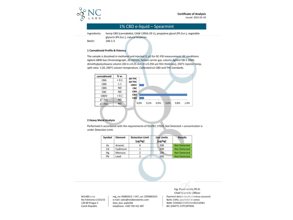 - Състав: Глицерин 80%, Пропилен гликол 20%, 1% CBD (100mg), Натурални канабиноидни терпени.