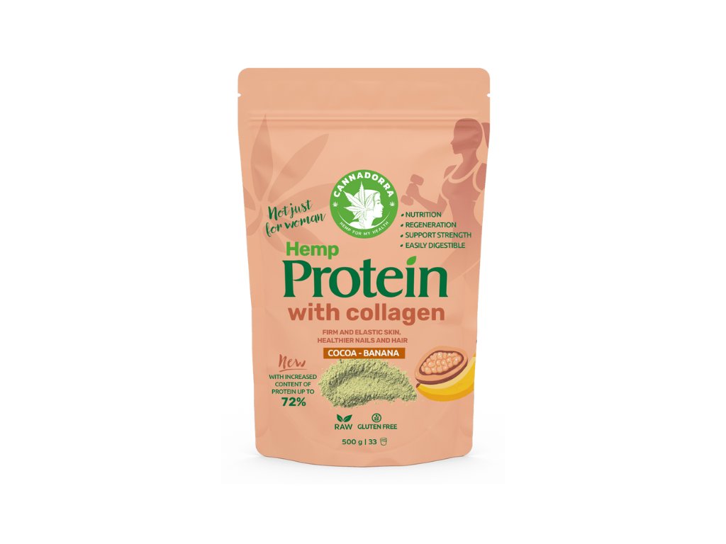 Hemp protein with collagen, cocoa and banana – with increased protein content (up to 72%) and perfect water solubility. Supports regeneration, strength and beauty – firm skin, healthier hair and nails.